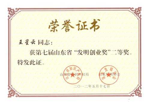王星云董事長(zhǎng)榮獲山東省“發(fā)明創(chuàng)業(yè)獎(jiǎng)”二等獎(jiǎng)