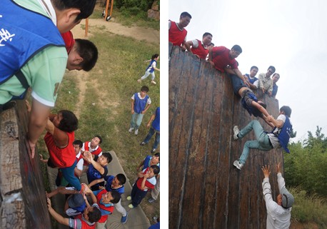 為了進(jìn)一步強(qiáng)化員工間的相互協(xié)作意識(shí)、奉獻(xiàn)精神,本次拓展訓(xùn)練的重頭戲“畢業(yè)墻”被安排在最后。畢業(yè)墻又稱求生墻,是指團(tuán)隊(duì)在不能借助任何外界工具(包括:衣服、皮帶、繩子等,所能用的資源只有每個(gè)人的身體)的情況下,共同努力翻越 4米高的光滑墻面。在培訓(xùn)師講解完規(guī)則和注意事項(xiàng)后,福田紅藍(lán)兩隊(duì)迅速合為一體,共同完成此項(xiàng)目。在前面的訓(xùn)練中,隊(duì)員們逐步學(xué)會(huì)了分工、協(xié)作和奉獻(xiàn),彼此間已建立了充分的信任。面對(duì)四米高墻,許多勇士甘當(dāng)人梯,讓其他隊(duì)友踩著自己的肩膀攀爬,被上面的伙伴拽上墻去。最后一位隊(duì)友上去的方法讓人眼界大開:在多人保護(hù)下,高墻上一名隊(duì)友垂下身體,用胳膊拉住墻下隊(duì)友,其他人協(xié)助用力將兩人一同拉上墻來(lái)。在成功完成項(xiàng)目后,大家不禁歡呼雀躍。畢業(yè)墻項(xiàng)目的成功完成,是福田團(tuán)隊(duì)集體智慧的展現(xiàn),在過(guò)程中整個(gè)團(tuán)隊(duì)的凝聚力、合作精神以及隊(duì)員間的感情空前高漲,團(tuán)隊(duì)協(xié)作能力大大增強(qiáng),整個(gè)項(xiàng)目完成干凈利落,默契迅速。