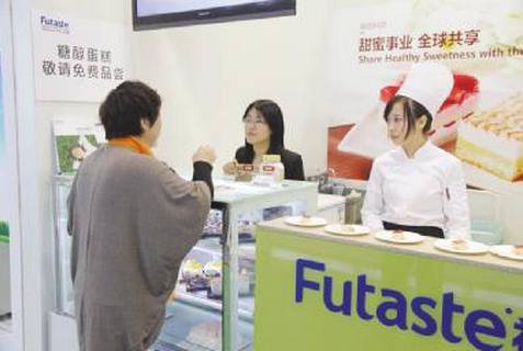 上圖為福田科技工作人員在2014 上海FIC 展會(huì)上介紹糖醇系列產(chǎn)品。