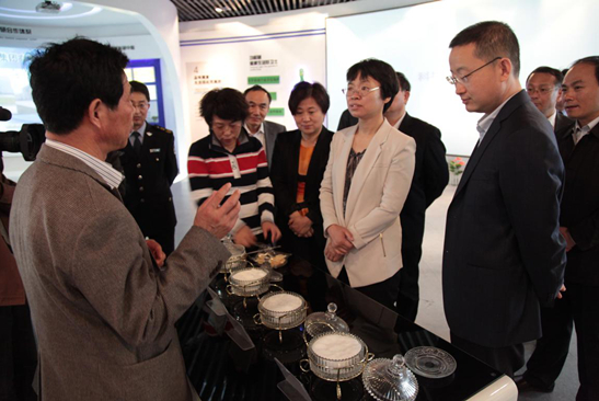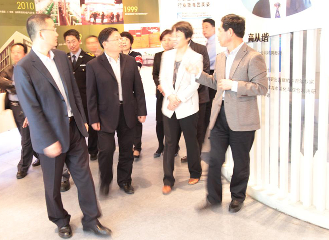 (上圖:馬越男局長(zhǎng)(中)在展廳展臺(tái)前駐足聽取公司董事長(zhǎng)王星云產(chǎn)品情況介紹)