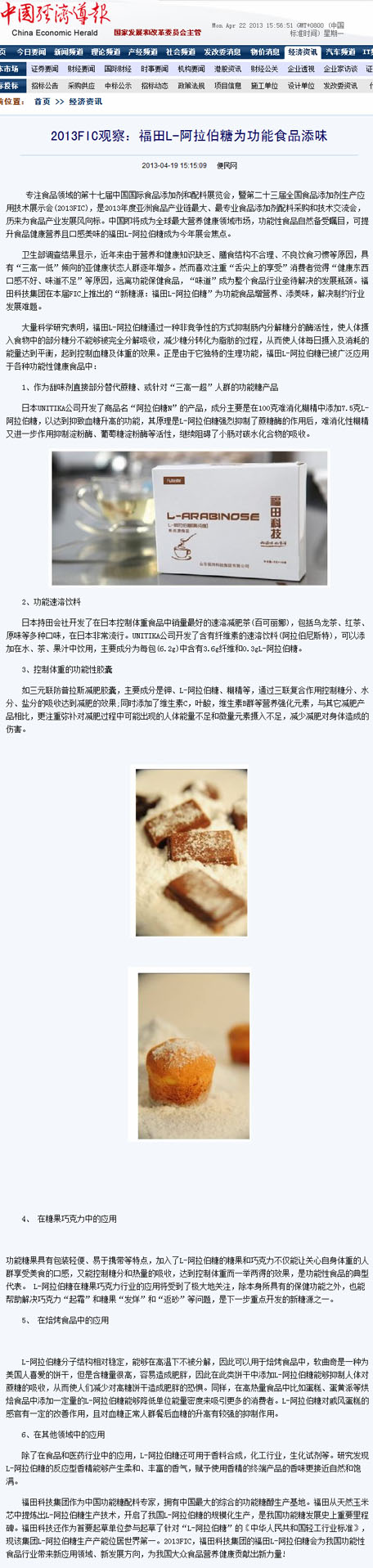 中國經(jīng)濟(jì)導(dǎo)報(bào)網(wǎng):2013FIC觀察 福田L(fēng)-阿拉伯糖為功能食品添味