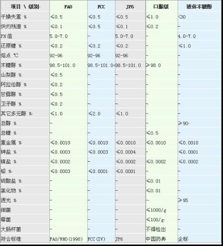 物化性質(zhì):白色結(jié)晶或結(jié)晶性粉末,味甜,甜度相當(dāng)于蔗糖,極易溶于水,(約160g/100ml), 微溶于乙醇和甲醇,熔點92℃-96℃,沸點216℃,熱值為16.72kj/g(與蔗糖相同)。溶于水時吸熱,故以固體形式食用時在口中會產(chǎn)生愉快的清涼感,10% 水溶液pH5.0-7.0。